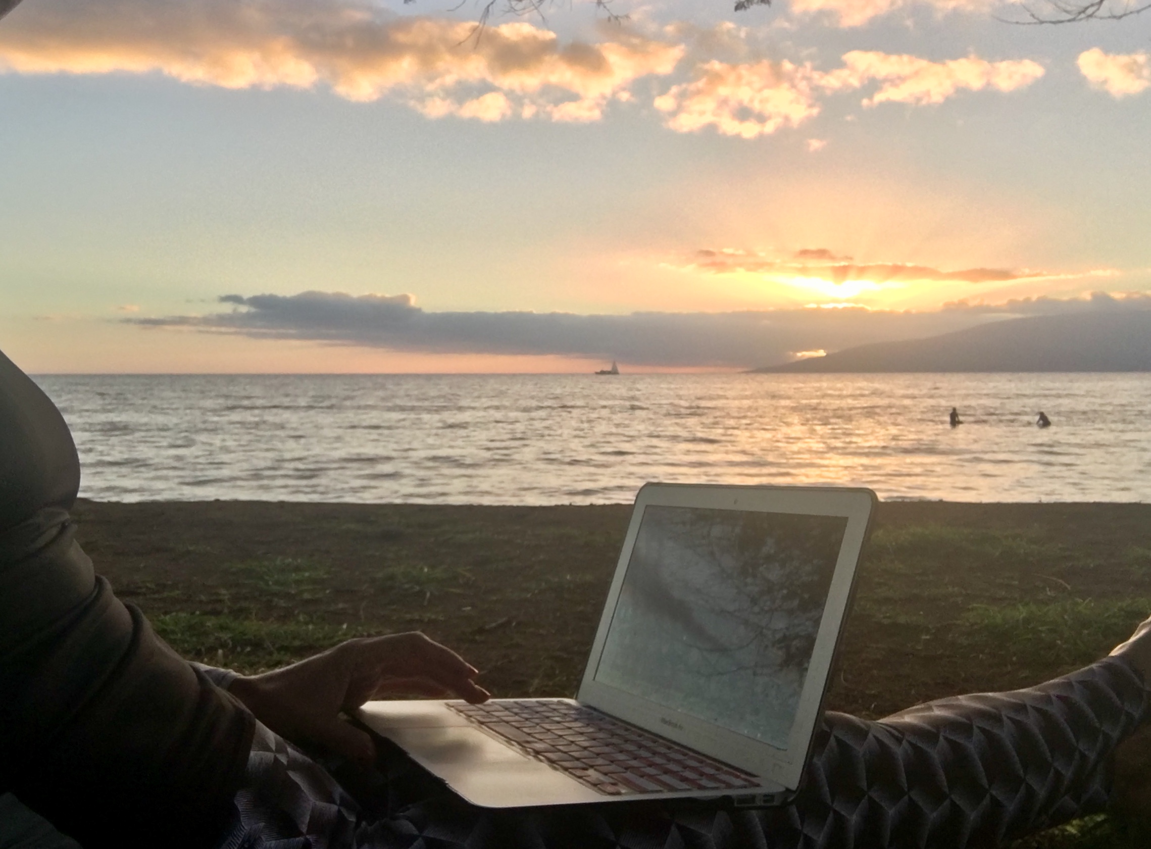 The sun has now vanished and the afterglow is numbed by the vog. I watch two surfers in the water, one smoothly jumping on his board and easily catching ever wave, the other paddling, exerting incredible energy and missing every wave. He laughs at every miss and I can’t help but relate… I am so happy to be sitting here with my laptop open, writing. Embarking on a new adventure, commiting these words to a post, not knowing exactly why I am writing, no brilliance, but rambling nonetheless.
